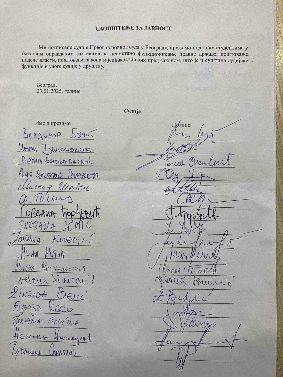 "Mi potpisane sudije Prvog osnovnog suda u Beogradu, pružamo podršku studentima u njihovim opravdanim zahtjevima za nesmetano funkcioniranje države, poštovanje podjele vlasti, poštovanje zakona i jednakosti svih pred zakonom, što je i suština sudijske funkcije i uloge sudija u društvu", navodi se u pismu.