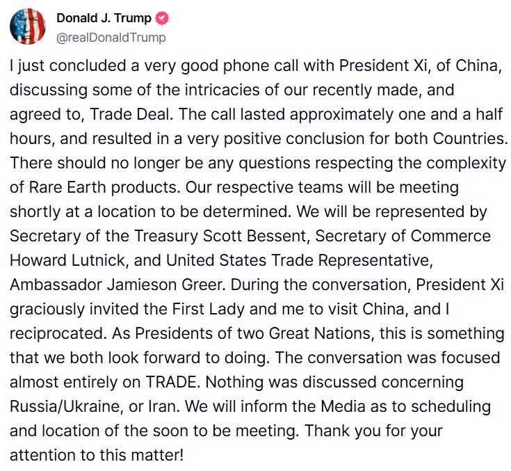U četvrtak, 5. juna 2025. godine, predsjednik Sjedinjenih Američkih Država Donald Trump i predsjednik Narodne Republike Kine Xi Jinping održali su telefonski razgovor, prvi od Trumpove inauguracije u januaru ove godine. Razgovor je inicirao Trump, a potvrđen je od strane kineske državne agencije Xinhua.