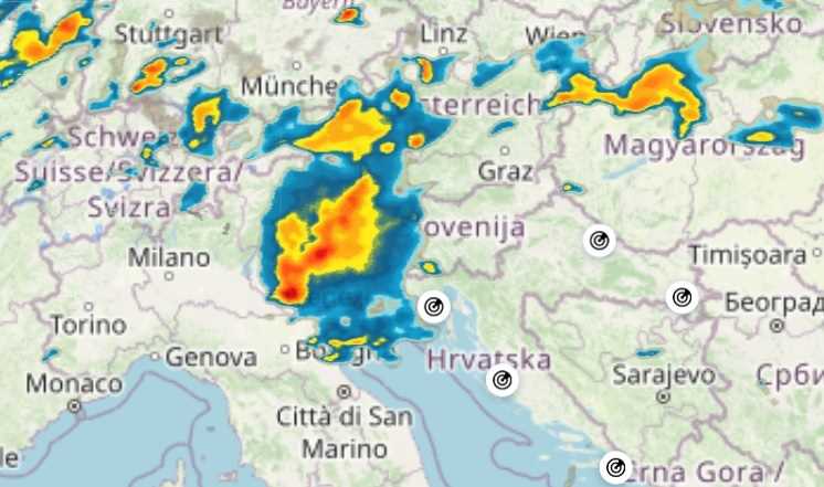 Prema radarskoj slici Državnog hidrometeorološkog zavoda Hrvatske (DHMZ), oluja se kreće preko sjevera Italija prema Sloveniji i istarskom području. Danas je za gotovo cijelu Hrvatsku uključen narandžasti meteoalarm zbog visoke mogućnosti za grmljavinsko nevrijeme. Za zagrebačko područje vjerovatnost je više od 90 posto, a za istarsko više od 70 posto. Karta DHMZ-a sad je označila istarsko i riječko područje crvenim upozorenjem za grmljavinsko nevrijeme.