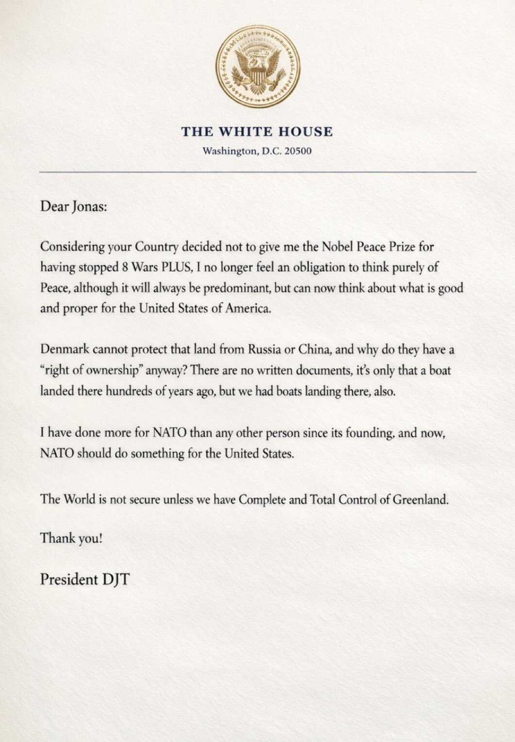 U neuobičajenoj tekstualnoj poruci, o kojoj je prvi izvijestio PBS, a koju je potvrdio i zvaničnik iz ureda norveškog premijera, Trump je direktno povezao svoje višestruke prijetnje preuzimanjem kontrole nad Grenlandom s činjenicom da mu Nobelova nagrada za mir nije dodijeljena, iako je, kako je naveo, „odavno zaslužuje“.