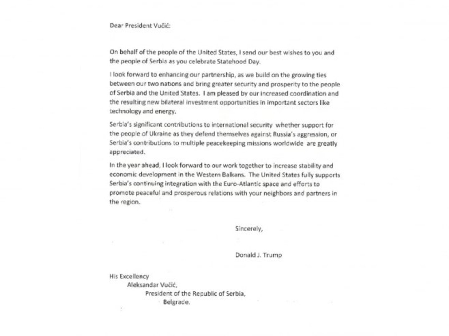 "Poštovani predsjedniče Vučiću, u ime naroda Sjedinjenih Američkih Država, upućujem Vama i građanima Srbije najiskrenije čestitke povodom Dana državnosti. Radujem se daljem jačanju našeg partnerstva, oslanjajući se na sve snažnije veze između naših zemalja, kako bismo zajednički doprinijeli većoj bezbjednosti i napretku građana Srbije i Sjedinjenih Američkih Država", naveo je Trump u čestitki koja je objavljena na Instagramu.
