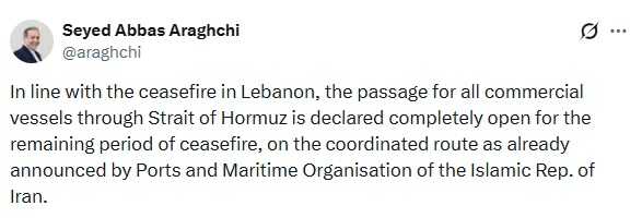 "U skladu s primirjem u Libanu, prolaz za sve komercijalne brodove kroz Hormuški moreuz proglašava se potpuno otvorenim za preostali period trajanja primirja, i to duž koordinirane rute koju je ranije najavila Organizacija za luke i pomorstvo Islamske Republike Iran", stoji u njegovoj objavi na X-u.