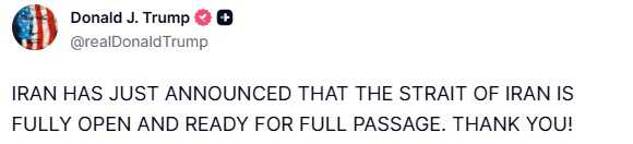 Predsjednik Sjedinjenih Američkih Država Donald Trump objavio je da je Hormuški prolaz otvoren.