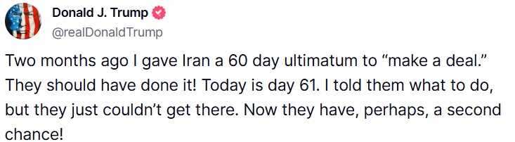 “Prije dva mjeseca dao sam Iranu 60-dnevni ultimatum da ‘postignu dogovor’. Trebali su to uraditi! Danas je 61. dan. Rekao sam im šta trebaju da urade, ali jednostavno nisu uspjeli. Sada, možda, imaju drugu priliku!”, napisao je Trump, aludirajući na sve veće tenzije između Vašingtona i Teherana.