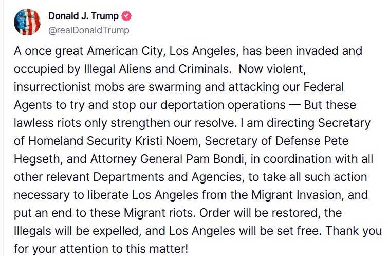 Naredio sam državnoj sekretarki za domovinsku sigurnost Kristi Noem, sekretaru odbrane Peteu Hegsethu i državnoj tužiteljici Pam Bondi, u koordinaciji s ostalim relevantnim agencijama, da preduzmu sve potrebne mjere kako bi oslobodili Los Anđeles od migrantske invazije i zaustavili ove migrantske nerede.
