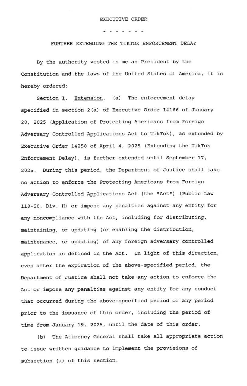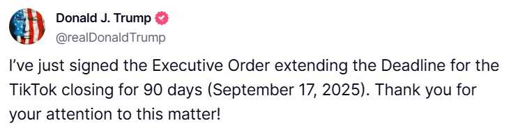 Predsjednik Sjedinjenih Američkih Država Donald Trump potpisao je novu izvršnu naredbu kojom se produžava rok za zatvaranje kineske aplikacije TikTok u SAD-u za dodatnih 90 dana, odnosno do 17. septembra 2025. godine.