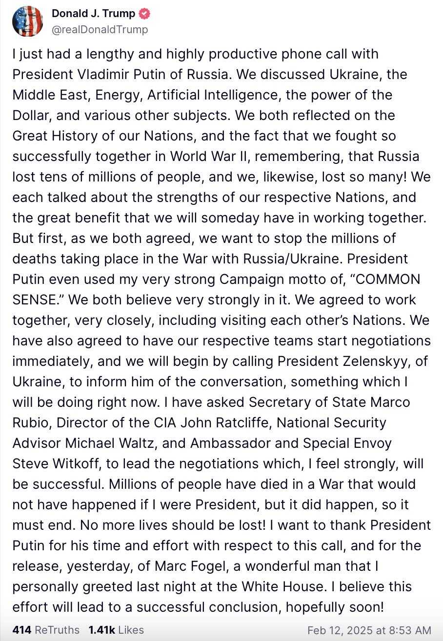 "Upravo sam imao dug i veoma produktivan telefonski razgovor sa predsednikom Rusije Vladimirom Putinom", objavio je na svojoj društvenoj mreži Truth Social predsjednik Sjedinjenih Amerićkih Država Donald Trump.