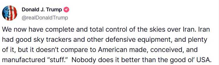 Predsjednik Sjedinjenih Američkih Država Donald Trump objavio je da američka vojska sada ima „potpunu kontrolu“ nad zračnim prostorom Irana.