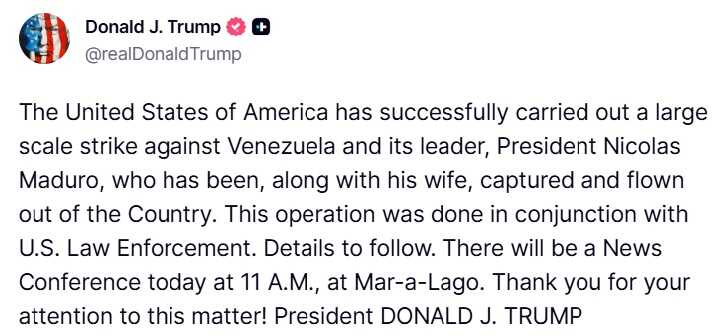 "Sjedinjene Američke Države uspješno su izvele napad velikih razmjera na Venezuelu i njenog lidera, predsjednika Nicolasa Madura, koji je, zajedno sa svojom suprugom, uhapšen i izveden iz zemlje", objavio je Donald Trump.