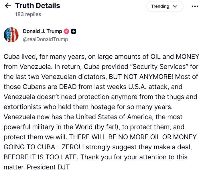 "Kuba je godinama živjela od velikih količina nafte i novca iz Venezuele. Zauzvrat, Kuba je pružala „sigurnosne usluge“ za posljednja dva venecuelanska diktatora, ali više ne!