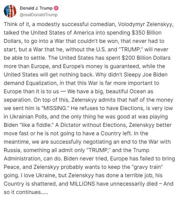 "Zamislite to, skromno uspješan komičar, Volodimir Zelenski, nagovorio je Sjedinjene Američke Države da potroše 350 milijardi dolara, da uđu u rat koji nije mogao dobiti, koji nikada nije morao početi, ali u rat koji je on, bez SAD-a i Trumpa nikada neće moći da se nagodi", napisao je ja svojoj društvenoj mreži Truth Social predsjednik SAD Donald Trump.