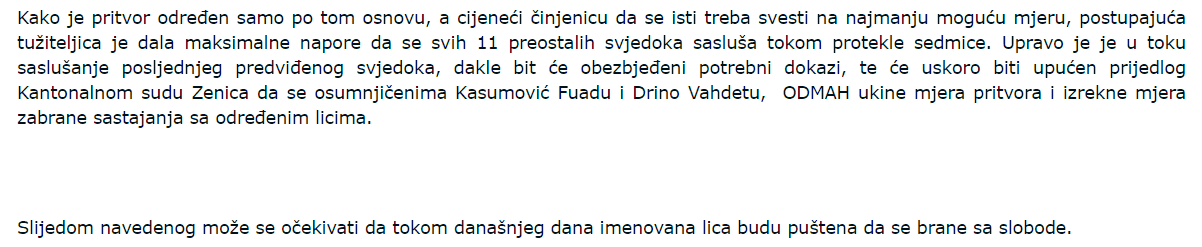 U saopćenju za javnost navedeno je i da su obojica saslušani i najavljeno da će "uskoro biti upućen prijedlog Kantonalnom sudu Zenica da se osumnjičenima Kasumović Fuadu i Drino Vahdetu, ODMAH ukine mjera pritvora i izrekne mjera zabrane sastajanja sa određenim licima".