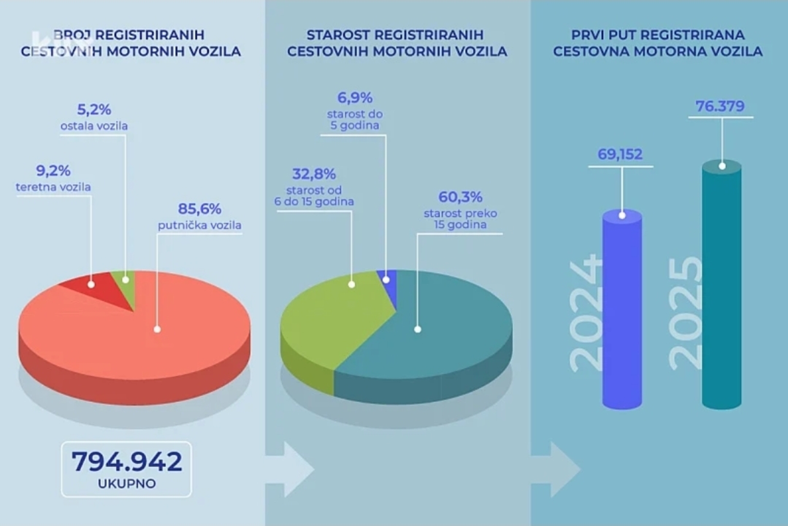 Federalni zavod za statistiku objavio je podatke o registraciji cestovnih motornih vozila u 2025. godini. Kako su naveli u izvještaju, u 2025. godini je registrovano ukupno 794.942 vozila, što je za 1,8 posto više u odnosu na 2024. kada je ukupno registrovano 781.084 vozila.