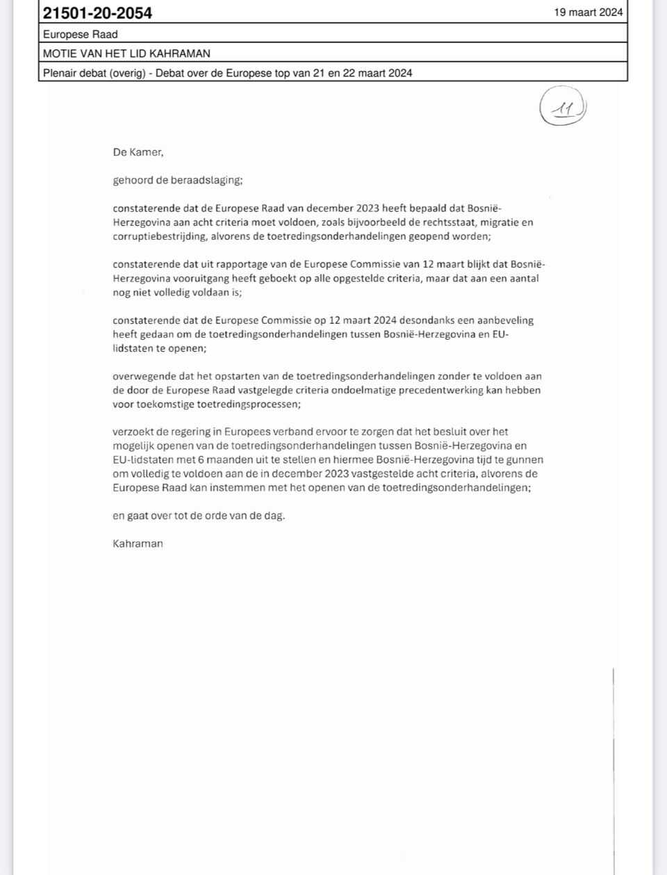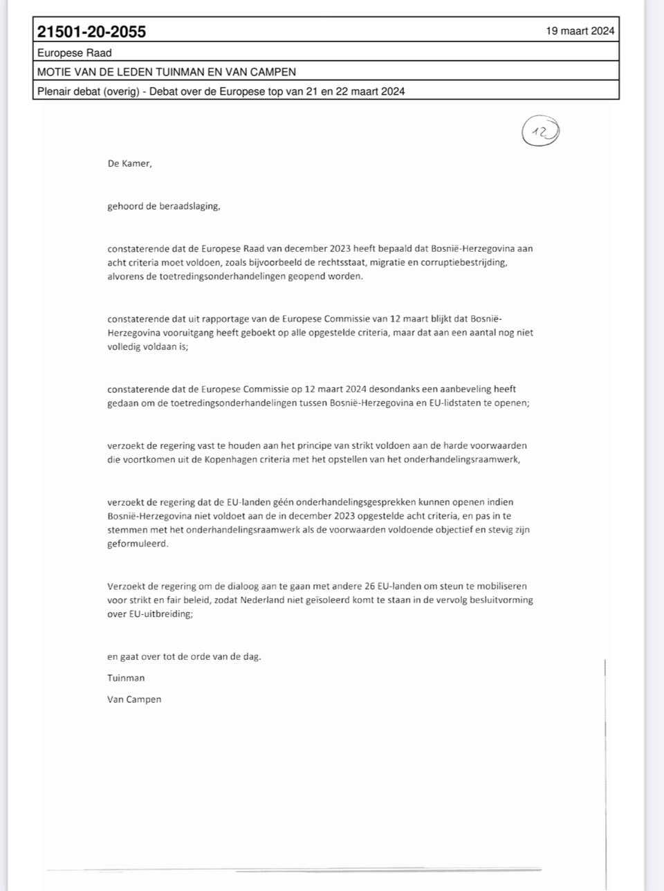 Poziva se Vladu da se striktno pridržava principa strogih uslova koji proizilaze iz Kopenhagenskih kriterija prilikom izrade pregovaračkog okvira, traži se od Vlade da zemlje EU ne mogu otvoriti pregovore ako BiH ne ispuni osam zacrtanih kriterija od decembra 2023. Evropska unija bi trebala pristati na pregovarački okvir samo ako se uslovi procijene na dovoljno objektivan i čvrst način. Traži se od vlade da uđe u dijalog s ostalih 26 zemalja EU kako bi mobilizirala podršku za stroge i poštene politike, kako Nizozemska ne bi bila izolirana u naknadnom donošenju odluka o proširenju EU.