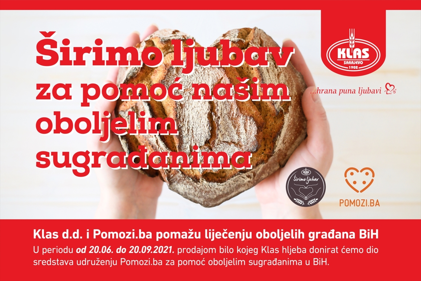 Kampanja traje u periodu od 20. juna do 20. septembra ove godine, a dio prihoda od prodaje svakog Klas hljeba će biti doniran udruženju "Pomozi.ba" za pomoć oboljelim građanima BiH.