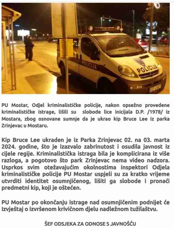Pripadnici MUP-a Hercegovačko-neretvanskog kantona uhapsili su D.P. (1978.) iz Mostara zbog sumnje da je ukrao kip Brucea Leea iz parka Zrinjevac.
