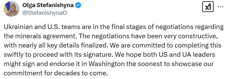 Pregovori o američko-ukrajinskom sporazumu o mineralima su "u završnoj fazi", rekla je zamjenica ukrajinskog premijera za evropske i euroatlantske integracije Olga Stefanishyna X.