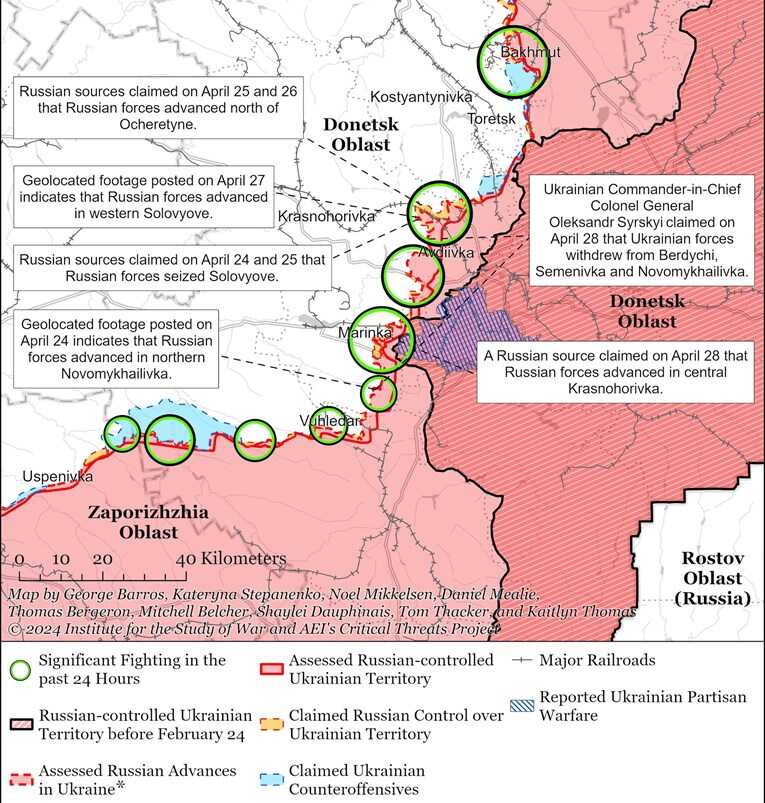 "Ruske snage će vjerovatno ostvariti značajne taktičke dobitke u nadolazećim sedmicama dok Ukrajina čeka da američka sigurnosna pomoć stigne na front, ali je malo vjerovatno da će nadvladati ukrajinsku obranu", piše ISW.