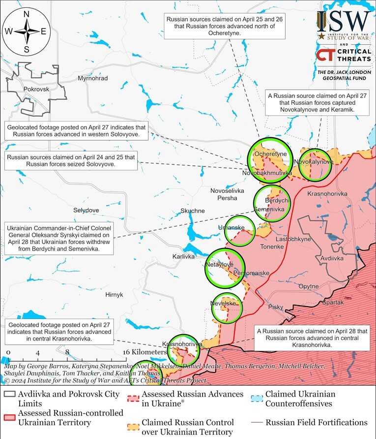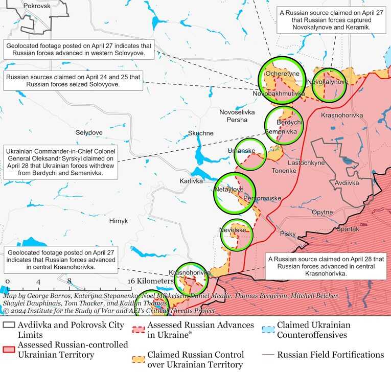 Vojni blogeri s obje strane izvijestili su da su ruske snage prešle vodeni tok i preuzele kontrolu nad naseljima Semenivka i Berdiči, što je komandant ukrajinske vojske Oleksandr Siriski jučer potvrdio u objavi na Telegramu. Rusija je rasporedila do četiri brigade u ofanzivnim operacijama u tom području, rekao je Siriski.