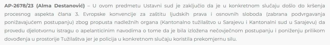 Ustavni sud Bosne i Hercegovine donio je odluku u predmetu AP-2678/23, kojom je utvrdio da su Kantonalno tužilaštvo u Sarajevu i Kantonalni sud u Sarajevu prekršili član 3. Evropske konvencije o ljudskim pravima, koji zabranjuje nečovječno i ponižavajuće postupanje.