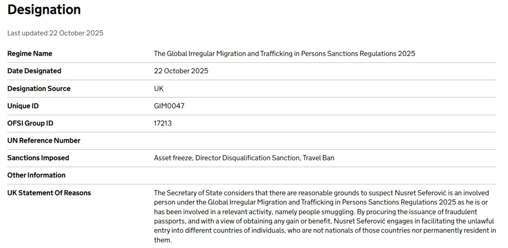 Velika Britanija uvela je sankcije protiv više osoba i kompanija povezanih s organizovanim krijumčarenjem migranata i falsifikovanjem dokumenata na području Balkana. U okviru novih mjera, sankcionisan je i hrvatski državljanin Nusret Seferović, koji se, prema navodima britanskog Ministarstva vanjskih poslova, dovodi u vezu s mrežom za izdavanje lažnih pasoša i ličnih dokumenata, prenosi Politicki.ba.