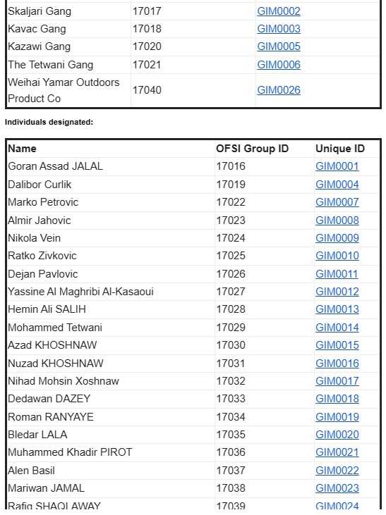 Sankcije su uvedene i protiv više pojedinaca iračkog porijekla, poput Gorana Assada Jalala, Hemin Alija Saliha i Dedawana Dazeya, koji su odgovorni za ilegalno prebacivanje migranata iz Azije i sa Bliskog istoka u Evropu, koristeći hladnjače i tajne skloništa u Francuskoj i Belgiji.