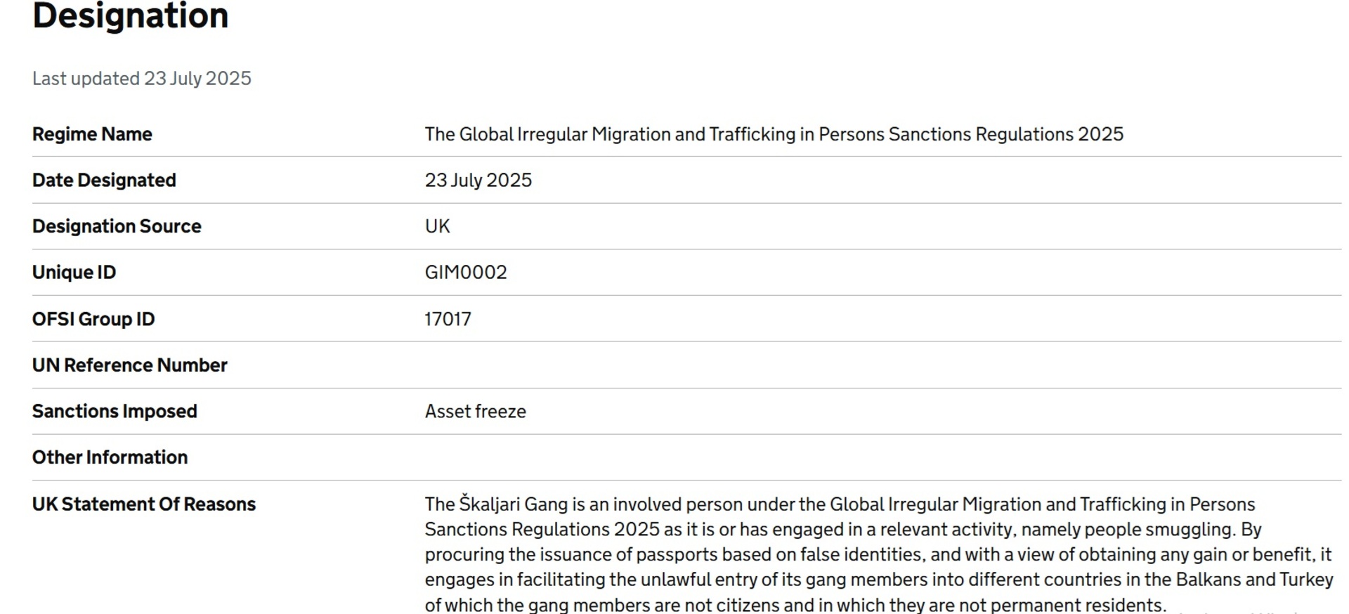 Velika Britanija je 23. jula 2025. godine uvela prve sankcije u okviru novog globalnog režima borbe protiv krijumčarenja ljudi, ciljajući 25 pojedinaca i kompanija koji, prema britanskim vlastima, predstavljaju srce organizovanog kriminala koji potiče neregularne migracije ka toj zemlji. Poseban fokus britanskih vlasti je na kriminalnim mrežama koje djeluju s područja Zapadnog Balkana, Bliskog istoka i Azije.