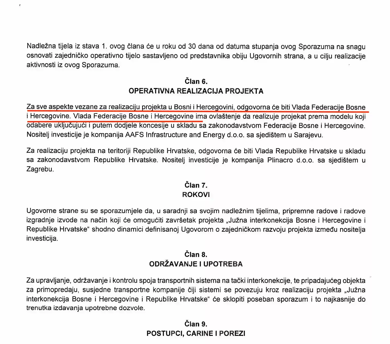 Dalje piše da će “ugovorne strane osigurati usklađivanje svih pojedinosti oko projektovanja, pripreme i izvođenja svih radova na izgradnji interkonekcije, te će se također sporazumjeti o usklađivanju dinamike svih procedura za ishođenje potrebnih saglasnosti i dozvola od strane nadležnih tijela Bosne i Hercegovine i Republike Hrvatske, te procedura u postupcima izgradnje i stavljanja gasovoda u upotrebu. (…)