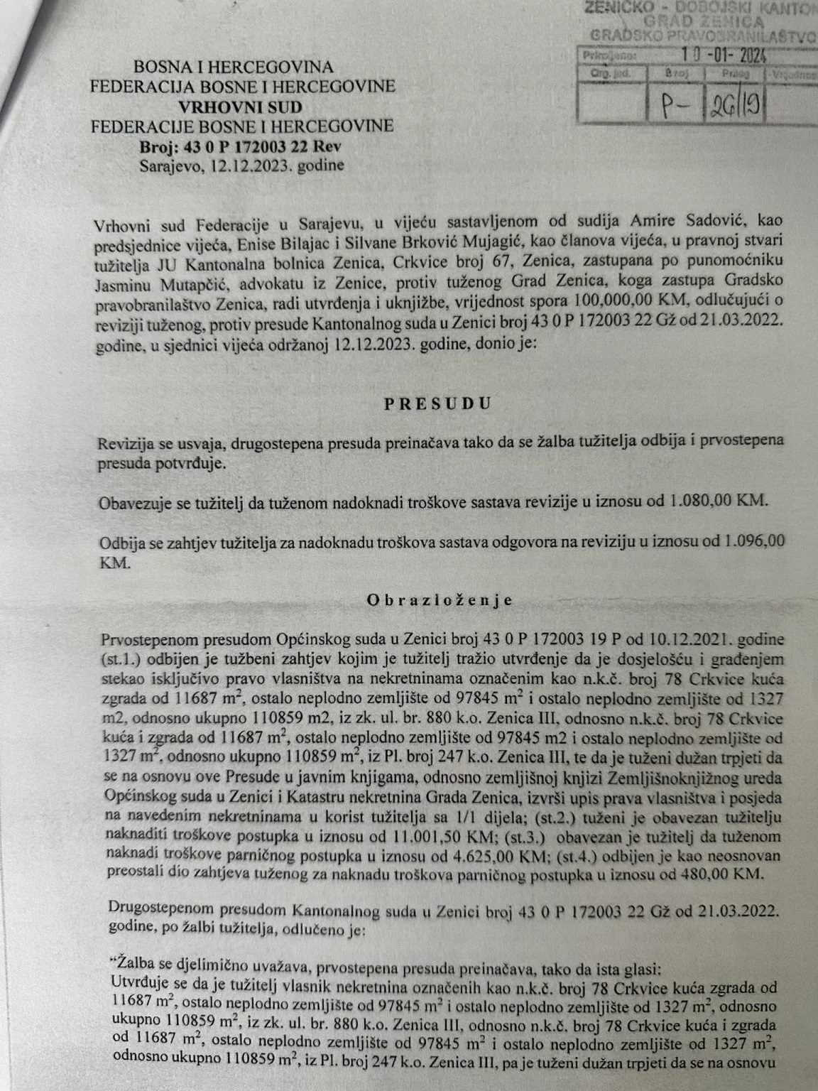 Presudom Vrhovnog suda Federacije BiH donesenom u pravnoj stvari tužitelja JU Kantonalna bolnica Zenica protiv Grada Zenica radi utvrđenja i uknjižbe prava vlasništva na nekretninama ( zemljište i zgrade u krugu Kantonalne bolnice Zenica) usvojena je revizija Grada Zenica.