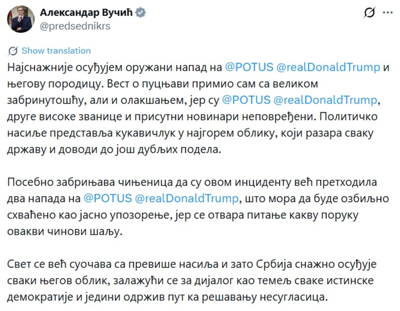 Predsjednik Srbije Aleksandar Vučić najsnažnije je osudio oružani napad na predsjednika SAD Donalda Trumpa i njegovu porodicu, navodeći da je vijest o pucnjavi u Bijeloj kući primio sa velikom zabrinutošću, ali i olakšanjem jer su predsjednik, druge visoke zvanice i novinari ostali nepovrijeđeni.