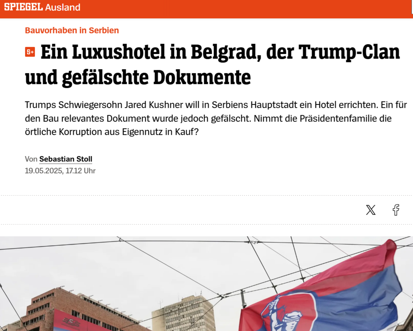 Zet predsjednika Sjedinjenih Američkih Država Donalda Trumpa Jared Kushner planira gradnju luksuznog hotela el u Beogradu, ali se desio "neočekivani preokret" kad se ispostavilo da je jedan dokument neophodan za realizaciju projekta falsificiran, piše njemački Der Spiegel.
