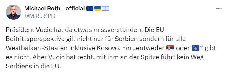 Potpredsjednik Socijaldemokratske partije Njemačke i predsjednik Vanjsko-političkog odbora Bundestaga Michel Roth oštro je upozorio predsjednika Srbije Aleksandra Vučića da se ne igra ratnih igara na Balkanu.