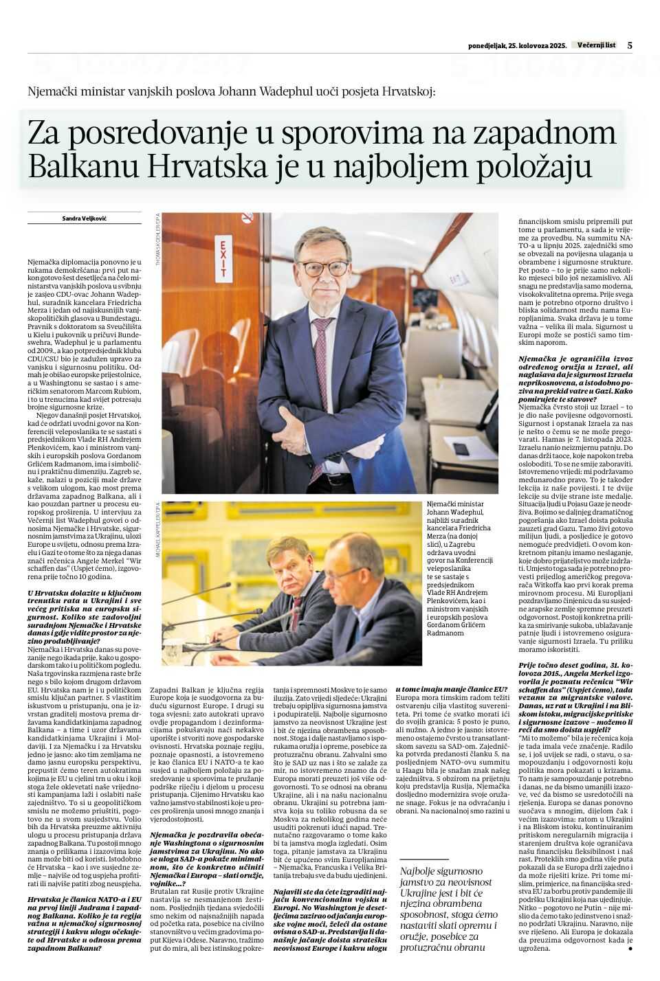 "Zapadni Balkan je ključna regija Evrope koju se suočava s brojnim izazovima, od spora Srbije i Kosova do političke krize u Bosni i Hercegovini. Hrvatska, zahvaljujući svom položaju, iskustvu i vezama, ima najbolju poziciju da doprinese rješavanju tih nesuglasica", poručio je ministar vanjskih poslova Njemačke Johann Wadephul.