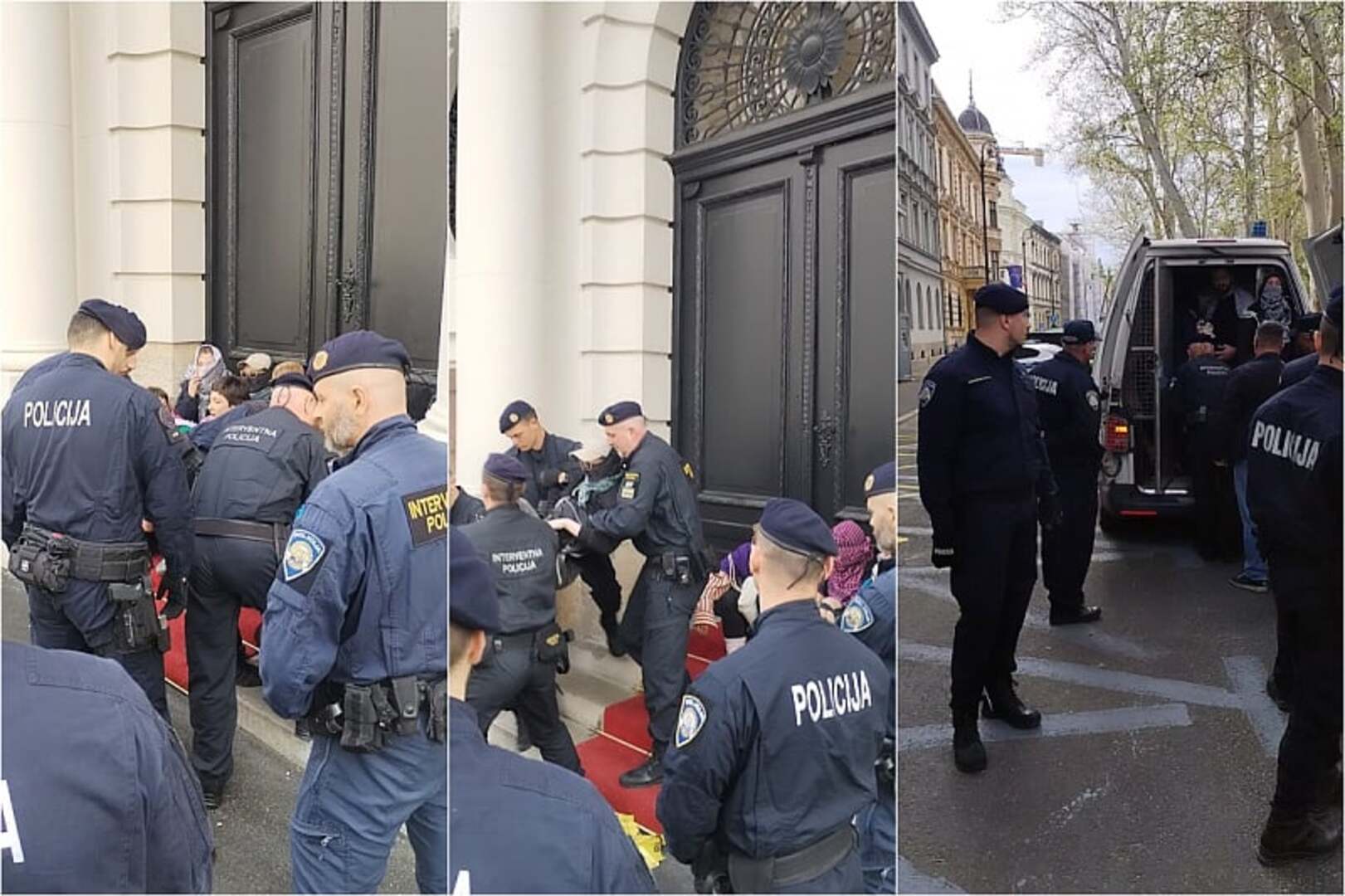 Deseci građana privedeni su danas u Zagrebu nakon što su nenasilno blokirali ulaz u zgradu Ministarstva vanjskih i evropskih poslova, izražavajući tako protest protiv, kako navode, “hrvatskog sudioništva u genocidu koji se odvija nad palestinskim narodom u Gazi”.