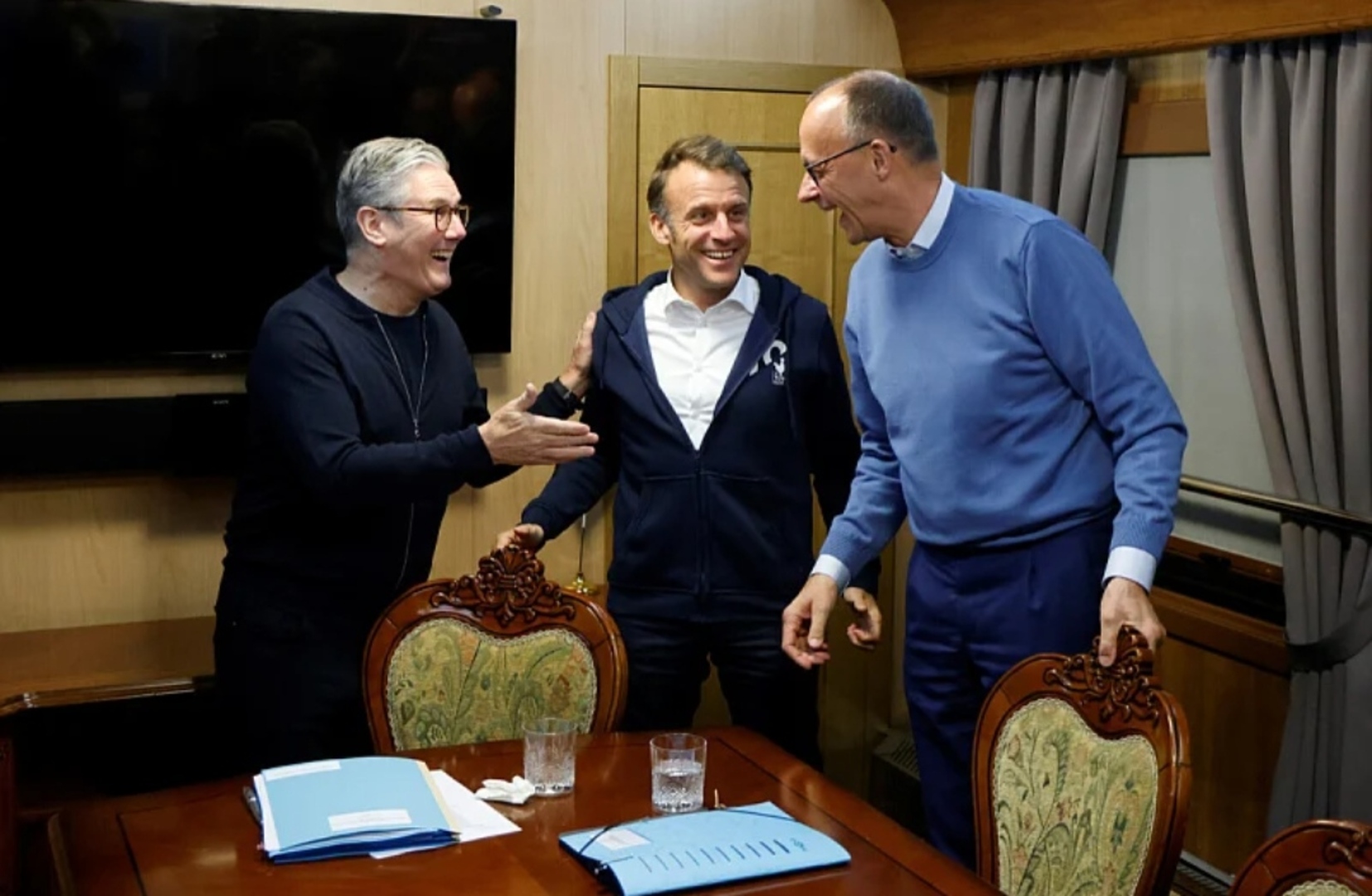 Portparolka Ministarstva vanjskih poslova Rusije Marija Zaharova objavila je na Telegramu videosnimak na kojem su predsjednik Francuske Emmanuel Macron, premijer Velike Britanije Keir Starmer i njemački kancelar Friedrich Merz u vozu za Kijev, a na kojem je Macron sakrio od kamera nepoznati predmet.