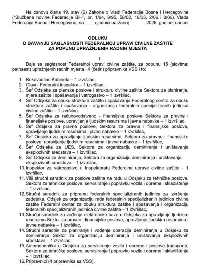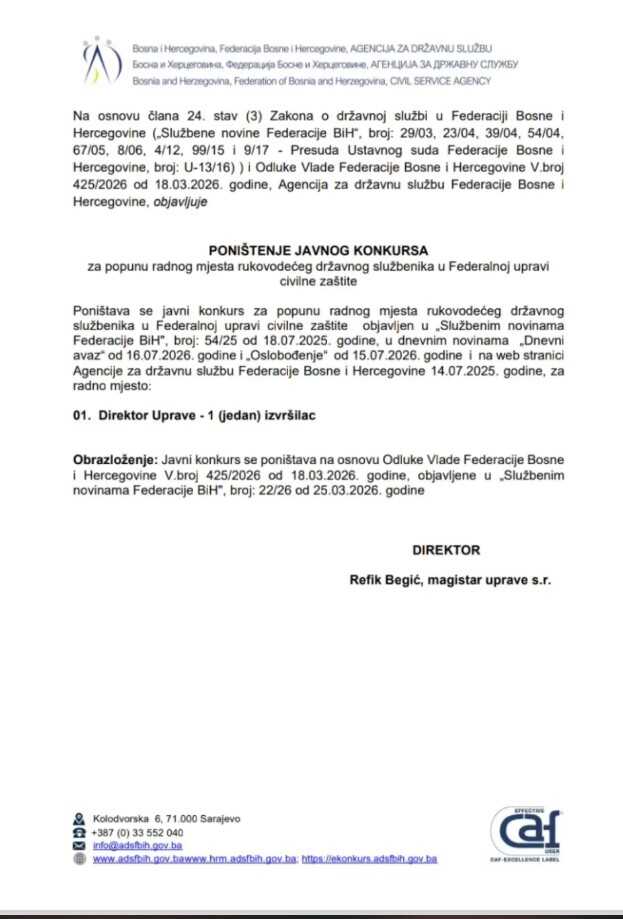 - Vlada FBiH je na 68. sjednici održanoj 18.3.2026. godine poništila konkurs za postavljanje direktora Federalne uprave civilne zaštite, bez ikakvog pravnog obrazloženja za takvo postupanje, ali to je nije spriječilo da donese Odluku o davanju saglasnosti Federalnoj upravi civilne zaštite za popunu "upražnjenih" radnih mjesta.
