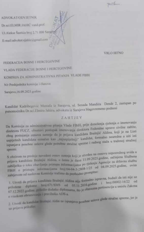 Iz dokumentacije koja je dostavljena Faktoru jasno proizilazi da je Mustafa Kadribegović tražio preispitivanje zakonitosti liste uspješnih kandidata i da je putem punomoćnika ukazao na ozbiljne nepravilnosti u vezi sa kandidatom Aldinom Brašnjićem, koji ne ispunjava zakonom propisane uvjete i predloženo je ponavljanje procedure sastavljanja liste, a ne poništenje konkursa.