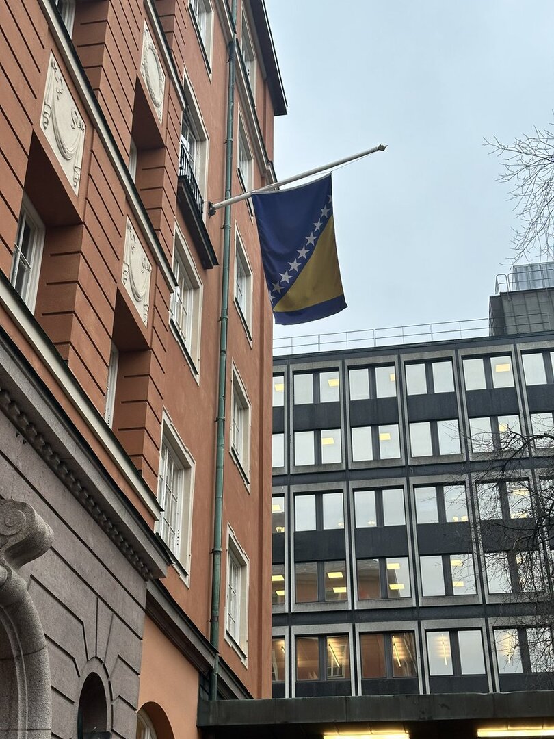 Zastava Bosne i Hercegovine na zgradi ambasade Bosne i Hercegovine u Štokholmu danas je spuštena na pola koplja.