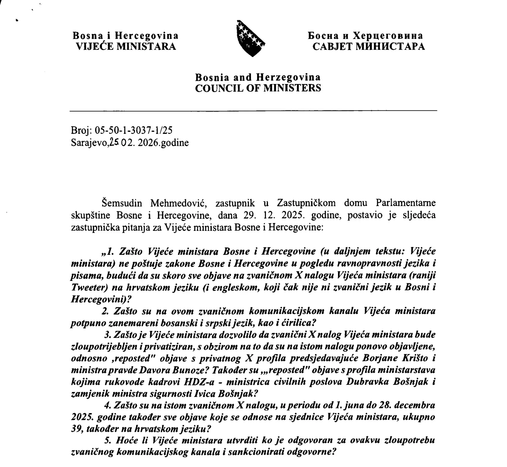 Vijeće ministara BiH u potpunosti poštuje zakonske odredbe o ravnopravnosti jezika i pisama, ustvrdili su iz te institucije u odgovoru na pitanja koja im je zastupnik u Parlamentarnoj skupštini BiH Šemsudin Mehmedović dostavio 29. decembra 2025. godine.