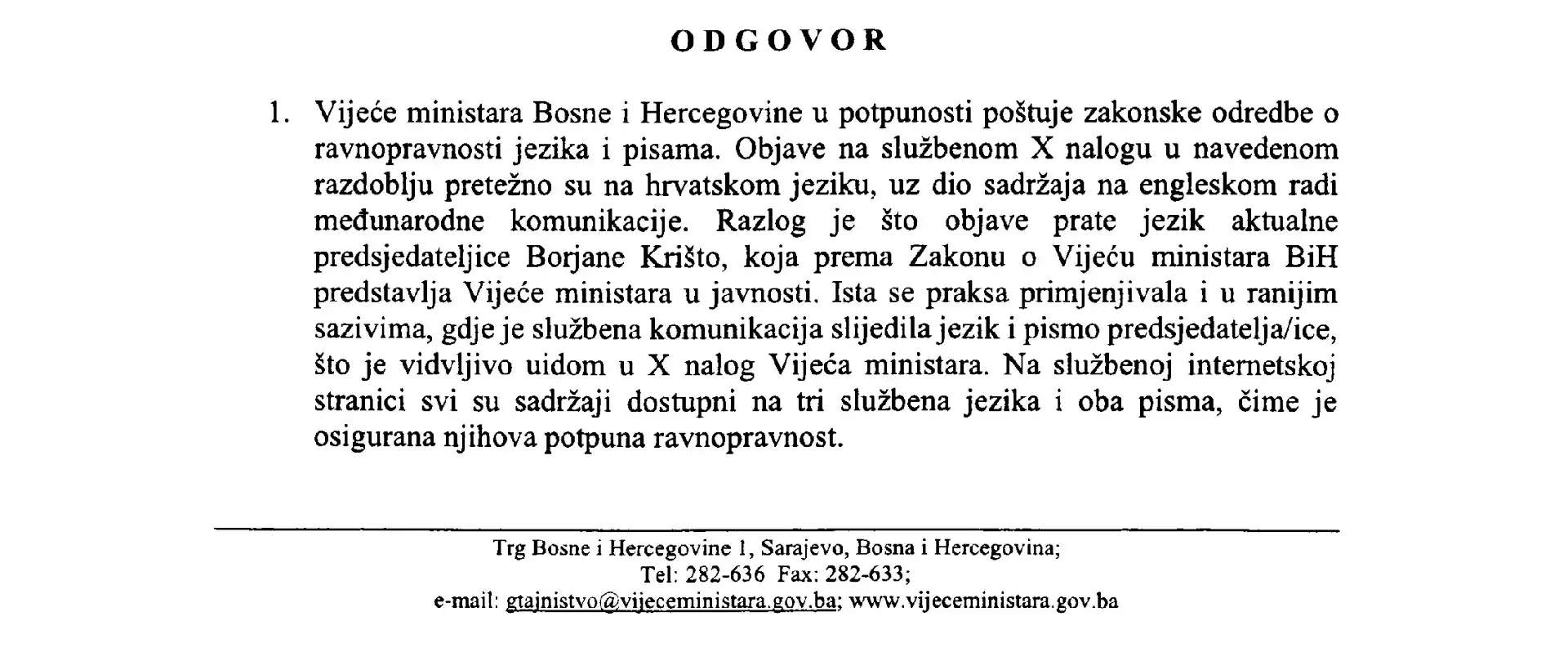U svom odgovoru Mehmedoviću, iz Vijeća ministara BiH su, kao što smo već i naveli na početku teksta, rekli da u potpunosti poštuju zakonske odredbe o ravnopravnosti jezika i pisama.