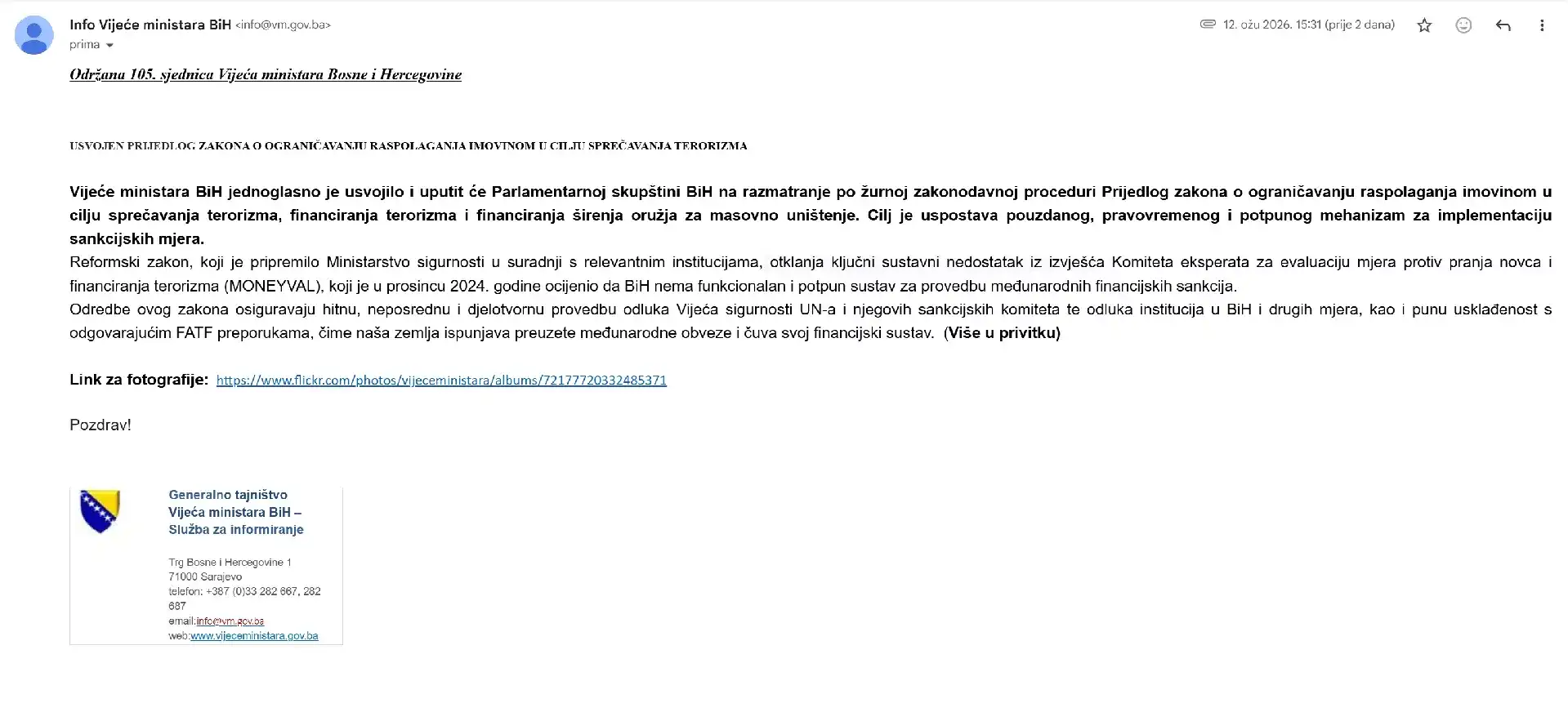 Dodajmo tome još i činjenicu da su sva saopštenja koja Vijeće ministara BiH (sa svog maila info@vm.gov.ba) dostavlja medijima isključivo na hrvatskom jeziku, a jedno od njih koje smo prije dva dana dobili na naš redakcijski mail možete pročitati i na slici ispod.