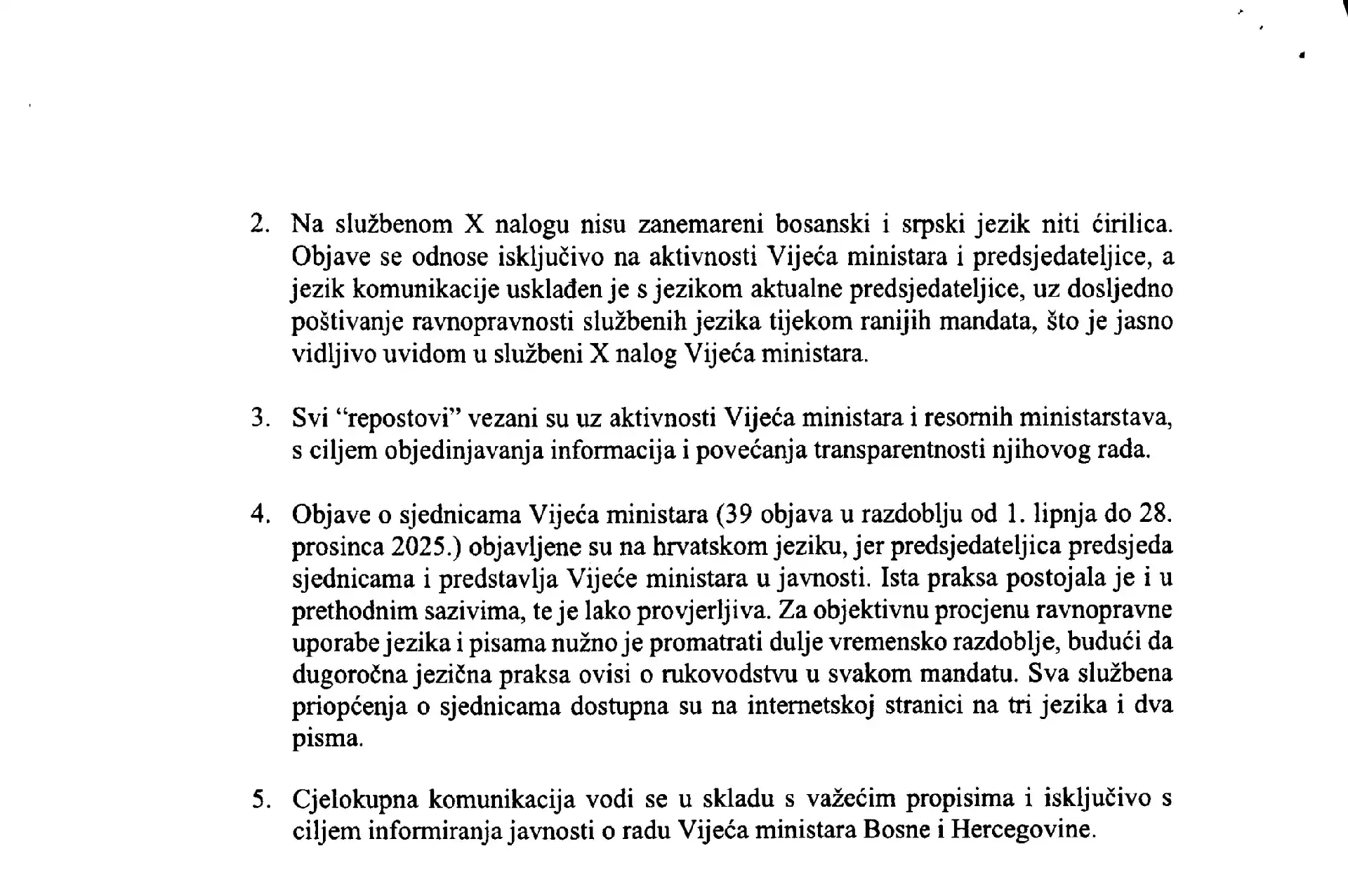 "Objave o sjednicama Vijeća ministara (39 objava u razdoblju od 1. lipnja do 28. prosinca 2025.) objavljene su na hrvatskom jeziku, jer predsjedateljica predsjeda sjednicama i predstavlja Vijeće ministara u javnosti. Ista praksa postojala je i u prethodnim sazivima, te je lako provjerljiva.