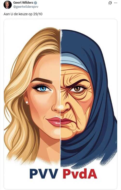 Na slici, koju je Wilders objavio na platformi X (bivši Twitter), prikazana su dva kontrastna lica: s lijeve strane mlada plavuša, a s desne starija žena namrgođena izraza lica i prekrivena maramom. Ispod slike stoji poruka: „Izbor je vaš 29. oktobra“, uz oznake „PVV“ ispod plavuše i „PvdA“ (Laburistička partija) ispod žene s maramom – referenca na datum parlamentarnih izbora zakazanih za 29. oktobar.