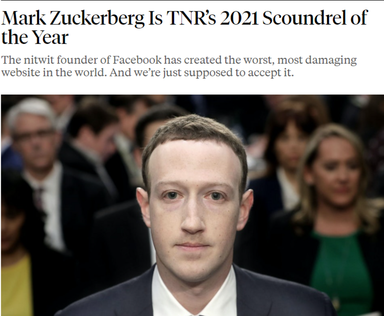 Magazin New Republic proglasio je osnivača Facebooka Marka Zuckerberga “nitkovom godine” zbog stvaranja “najgoreg, najštetnijeg sajta na svijetu”.