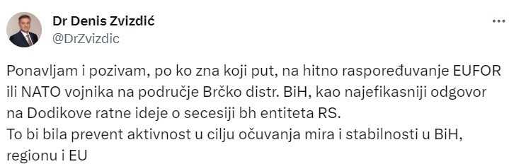 "Ponavljam i pozivam, po ko zna koji put, na hitno raspoređuvanje EUFOR ili NATO vojnika na područje Brčko Distrikta Bosne i Hercegovine, kao najefikasniji odgovor na Dodikove ratne ideje o secesiji bh. entiteta Rs", napisao je Denis Zvizdić.