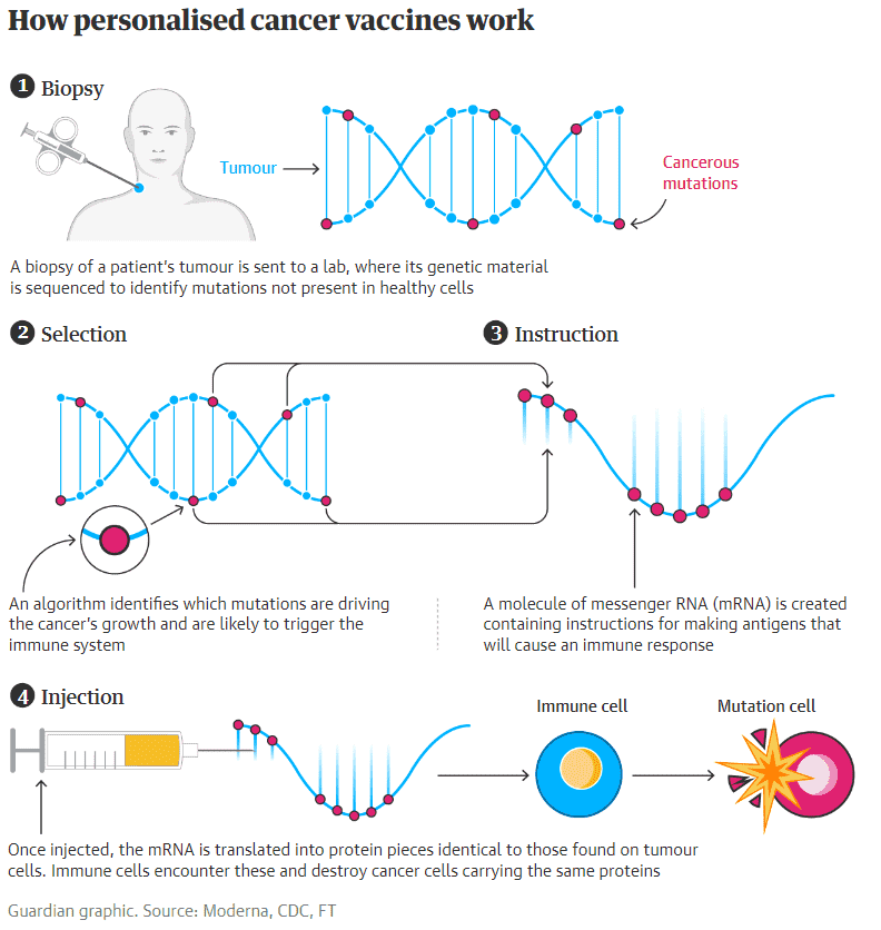 Molekul mRNA daje instrukcije stanicama da prave proteine. Ubrizgavanjem sintetičkog oblika, ćelije mogu ispumpati proteine koje želimo kako bi naš imunološki sistem bio sposoban. Vakcina protiv raka zasnovana na mRNA bi upozorila imuni sistem na rak koji već raste u tijelu pacijenta, tako da ga može napasti i uništiti, bez uništavanja zdravih ćelija.